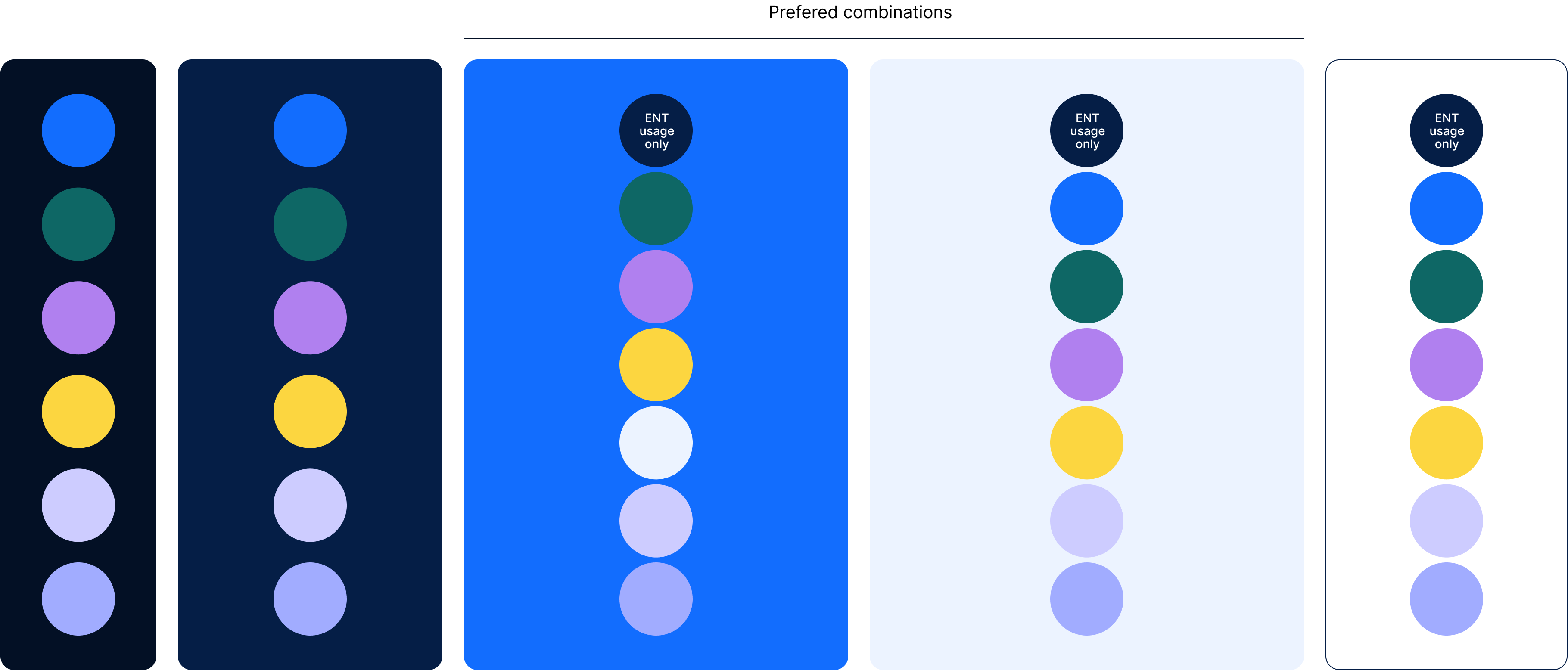 To ensure optimal contrast and the right visual output, here are some possible color combinations. The width of the background tiles represents usage proportions in layouts.